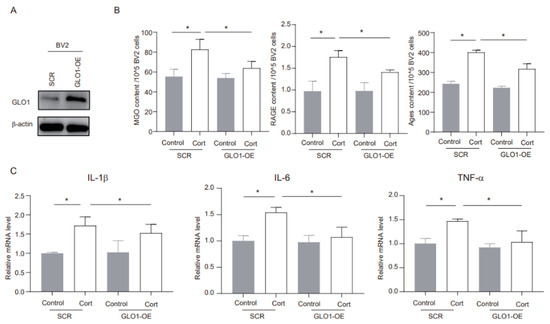 GLO1 is an enzyme that detoxifies harmful byproducts of glycolysis, particularly MGO [22]. We utilized shRNA to overexpress endogenous GLO1 and evaluated its potential role in corticosterone-mediated microglia inflammation. The overexpression method successfully increased GLO1 protein expression (Figure 4A). Furthermore, corticosterone exposure significantly elevated the levels of MGO and its derivatives in negative control (SCR) cells, while in GLO1-overexpressing (GLO1-OE) cells, these levels were notably reduced (Figure 4B). In addition, GLO1 overexpression significantly inhibited the corticosterone-induced increase in inflammatory markers (Figure 4C). Overall, these findings indicate that GLO1 may play a protective role in corticosterone-induced neuroinflammation by reducing the levels of MGO and its derivatives.