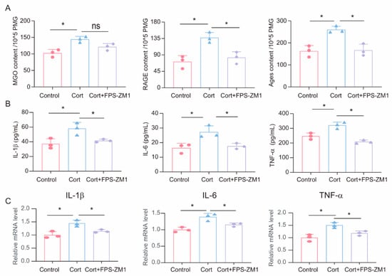 FPS-ZM1 ameliorates corticosterone-induced microglia inflammation and MGO and its derivatives. (A) Concentrations of MGO, RAGE, and Ages in primary microglia cells from Control, Cort, and Cort+FPS-ZM1 as determined by ELISA (n = 3, One-way ANOVA with Tukey’s post hoc test, * p < 0.05, ns: no significant). (B) Levels of IL-1β, IL-6, and TNF-α in primary microglia cells from Control, Cort, and Cort+FPS-ZM1 as determined by ELISA (n = 3, One-way ANOVA with Tukey’s post hoc test, * p < 0.05). (C) qRT-PCR assays monitoring the expression of inflammatory factors IL-1β, IL-6, and TNF-α in primary microglia cells from Control, Cort, and Cort+FPS-ZM1 (n = 3, One-way ANOVA with Tukey’s post hoc test, * p < 0.05).
