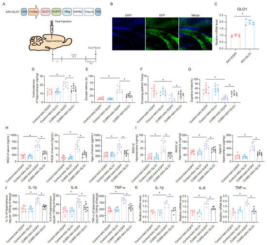 A specific adeno-associated virus (AAV) overexpressing GLO1 was constructed and microinjected into microglia in the hippocampus (Figure 6A). GFP expression confirmed infection of the hippocampal tissue (Figure 6B). The overexpression of GLO1 in the hippocampus following AAV-GLO1 infection was validated by qRT-PCR (Figure 6C). Subsequently, we assessed the effect of AAV-GLO1 on corticosterone levels in the hippocampus of mice. The results indicated that overexpression of GLO1 in the hippocampus alleviated the increase in corticosterone levels induced by CUMS (Figure 6D). Furthermore, the MWM and novel object recognition tests were employed to evaluate spatial learning and memory. AAV-GLO1 significantly reduced escape latency, increased the times of platform crossings, and enhanced the cognitive index in mice (Figure 6E–G). In addition, we measured the levels of MGO, AGEs, and RAGE in mouse serum and hippocampus, and the results showed that overexpression of GLO1 reduced MGO, AGEs, and RAGE levels in both the serum and hippocampus of CUMS mice (Figure 6H,I). These findings suggest that overexpression of GLO1 in the hippocampus can mitigate the toxic effects of AGEs and RAGE by reducing MGO levels. Moreover, we examined the changes in inflammatory factors in the hippocampus of mice. The results obtained from ELISA and qRT-PCR analyses revealed that the expression levels of inflammatory factors were markedly reduced in the group overexpressing GLO1 compared to the control group (Figure 6J,K). Based on these data, overexpression of GLO1 can partially clear MGO and, consequently, alleviate the inflammation cascade triggered by MGO-derived AGEs.