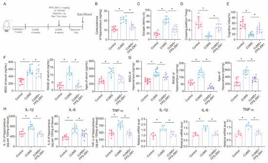 FPS-ZM1 ameliorates CUMS-induced cognitive impairment, neuroinflammation, and MGO and its derivatives in mice. (A) Schematic illustration of the experimental timeline for CUMS, FPS-ZM1 treatment, and behavioral testing. (B) Hippocampal corticosterone concentrations in Control, CUMS, and CUMS + FPS-ZM1 mice (n = 10; one-way ANOVA with Tukey’s post hoc test, * p < 0.05). (C,D) Escaping latency and Crossing-platform Times of Control, CUMS, and CUMS+FPS-ZM1 mice at the end of the CUMS procedure (n = 10, One-way ANOVA with Tukey’s post hoc test, * p < 0.05). (E) Cognitive Index of Control, CUMS, and CUMS+FPS-ZM1 mice at the end of the CUMS procedure (n = 10, One-way ANOVA with Tukey’s post hoc test, * p < 0.05). (F) Concentrations of MGO, RAGE, and Ages in the serum of Control, CUMS, and CUMS+FPS-ZM1 mice at the end of the CUMS procedure (n = 10, One-way ANOVA with Tukey’s post hoc test, * p < 0.05). (G) Concentrations of MGO, RAGE, and Ages in the hippocampus (n = 10, One-way ANOVA with Tukey’s post hoc test, * p < 0.05). (H) Levels of IL-1β, IL-6, and TNF-α in hippocampus lysates from Control, CUMS, and CUMS+FPS-ZM1 mice as determined by ELISA (n = 10, One-way ANOVA with Tukey’s post hoc test, * p < 0.05). (I) The mRNA level of IL-1β, IL-6, and TNF-α in hippocampal samples from Control, CUMS, and CUMS+FPS-ZM1 mice (n = 6, One-way ANOVA with Tukey’s post hoc test, * p < 0.05).