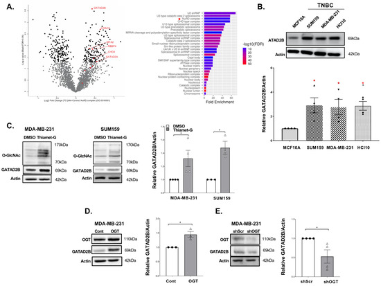 NuRD complex protein GATAD2B is regulated by OGT/O-GlcNAc in breast cancer cells. (A)-Mass spectrometric analysis of TNBC cells MDA-MB-231, treated with DMSO or OGA inhibitor Thiamet-G for 24 h, shows changes in protein level with 157 proteins down-regulated and 142 protein up-regulated (left). GO-analysis of up-regulated proteins (ShinyGO 0.75: GO-cellular components) shows enrichment of NuRD complex in Thiamet-G treatment (right). (B)-Immunoblot analysis of different TNBC cell lines shows elevated level of GATAD2B in TNBC cells compared to control of immortalized mammary gland cells MCF-10A (top and quantified graph shows significantly higher level of GATAD2B in TNBC compared to control of MCF-10A cells (bottom). One sample t-test against hypothetical value is reported as mean ± SEM, * p < 0.05. (C)-Immunoblots of TNBC cells MDA-MB-231 and SUM159, treated with DMSO or OGA inhibitor Thiamet-G for 24 h, show elevated level of GATAD2B in Thiamet-G treatment compared to control of DMSO (left and middle), and quantified graph showing significant increase in GATAD2B level in the presence of Thiamet-G compared to DMSO (right). One sample t-test against hypothetical value is reported as mean ± SEM, * p < 0.05. (D)-Immunoblots of TNBC MDA-MB-231 cells, control or with OGT overexpression, show increase in GATAD2B level in OGT overexpression, compared to control (left), and quantified graph shows significant increase in GATAD2B level in OGT overexpression, compared to control (right). One sample t-test against hypothetical value is reported as mean ± SEM, * p < 0.05. (E)-Immunoblots of TNBC MDA-MB-231 cells, transduced with control or OGT shRNA, show decrease in GATAD2B level in OGT knockdown, compared to control (left), and quantified graph shows significant decrease in GATAD2B level in OGT knockdown, compared to control (right). One sample t-test against hypothetical value is reported as mean ± SEM, * p < 0.05.
