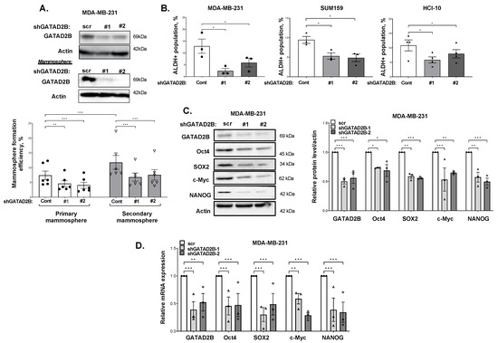 Given the role of NuRD proteins in regulating self-renewal and differentiating activity of stem cells [36], we hypothesized that GATAD2B may contribute to CSC phenotypes. To evaluate the potential role of GATAD2B in regulating cancer stem-like cells in breast cancer cells, protein level of GATAD2B in cancer stem-like cells enriched mammospheres was evaluated. Mammosphere assays enrich for cancer stem-like cells as these cells possess the self-renewal capacity required to sustain growth under non-adherent and serum free conditions [37]. The level of GATAD2B was significantly higher in mammosphere cultured breast cancer cells including MDA-MB-231, SUM159 and a patient-derived-xenograft (PDX) cell lines HCI-10, compared to control cells grown in adherence under similar media conditions (Supplementary Figure S2A), suggesting a potential role of GATAD2B in regulating cancer stem-like cells properties. To evaluate this further, expression of GATAD2B in breast cancer cells was inhibited by shRNA and stem-like cells properties of cancer cells were assessed by primary and secondary mammosphere formation assay. The ability of cells to generate secondary mammospheres upon repeated passaging is a hallmark of stemness, as it demonstrates sustained self-renewal [38]. Reducing GATAD2B expression with stable expression of RNAi significantly reduced both primary and secondary mammosphere formation in MDA-MB-231 cells compared to control cells (Figure 2A). Similar results were also observed in breast cancer cells SUM159 (Supplementary Figure S2B) and HCI-10 (Supplementary Figure S2C), suggesting GATAD2B may play a role in regulating stemness. Since the number of mammospheres reflects the abundance of cancer stem-like cells [39], we tested whether reducing GATAD2B levels alters the cancer stem-like cell population.