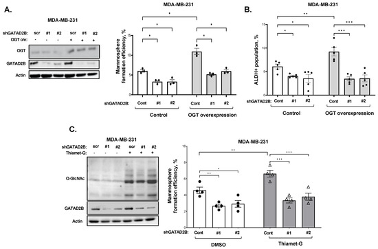 GATAD2B function downstream of OGT/O-GlcNAc in regulating CSCs in breast cancer. (A)-Lysates from control or OGT overexpressing MDA-MB-231 cells, transduced with scramble or GATAD2B shRNAs, were collected and analyzed by immunoblot using indicated antibodies (left). Control or OGT overexpressing MDA-MB-231 cells, transduced with scramble or GATAD2B shRNAs, were grown in mammosphere formation assay. The mammosphere formation efficiency in each condition was determined and presented in the quantified graph (right). Two-way ANOVA with Sidak test is reported as mean ± SEM, * p < 0.05. (B)-Quantified graph showing ALDH+ CSCs from control or OGT overexpressing MDA-MB-231 cells, transduced with scramble or GATAD2B shRNA. Two-way ANOVA with Sidak test is reported as mean ± SEM, * p < 0.05, ** p < 0.01. *** p < 0.001. (C)-Lysates from control or transduced with GATAD2B shRNAs MDA-MB-231 cells, treated with DMSO or OGA inhibitor Thiamet-G (2 µM) for 48 h, were collected and analyzed by immunoblot using indicated antibodies (left). Control or transduced with GATAD2B shRNAs MDA-MB-231 cells, treated with DMSO or OGA inhibitor Thiamet-G (2 µM) for 48 h, were grown in mammosphere formation assay. The mammosphere formation efficiency in each condition was determined and presented in the quantified graph (right). Two-way ANOVA with Sidak test is reported as mean ± SEM, * p < 0.05, ** p < 0.01. *** p < 0.001.