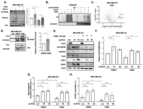 O-GlcNAc protects GATAD2B from ITCH-mediated proteasomal degradation. (A)-TNBC cells MDA-MB-231 were treated with DMSO or OGT inhibitor OSMi-1 (100 µM) for 24 h, then subsequently treated with DMSO or proteasome inhibitor MG-132 (10 µM) for an additional 24 h before collecting for immunoblot using indicated antibodies (left). Quantified graph of blots from MDA-MB-231 cells treated with DMSO, OSMi-1 or MG-132 (right). Two-way ANOVA with Sidak test is reported as mean ± SEM, * p < 0.05. (B)-HEK-293T cells, transfected with HA-tagged Ubiquitin, were treated with DMSO or with OGT inhibitor OSMi-1 (100 µM) for 24 h prior to lysate collection. Lysate from each sample was immunoprecipitated using anti-GATAD2B antibody or IgG and was subsequently analyzed by immunoblot using indicated antibodies. (C)-Volcano plot of mass spectrometry analysis showing ITCH being co-IPed together with GATAD2B in TNBC cells MDA-MB-231 by anti-GATAD2B antibody. (D)-TNBC cells MDA-MB-231 were treated with DMSO or OGT inhibitor OSMi-1 (100 µM) for 24 h, then were collected for immunoprecipitation using anti-GATAD2B antibody or IgG. Immunoprecipitated proteins were analyzed by Western blot using indicated antibodies (left). Quantified graph shows increase ITCH level being co-immunoprecipitated with GATAD2B in the presence of OGT inhibitor OSMi-1 (100 µM) compared to control of DMSO (right). One sample t-test against hypothetical value is reported as mean ± SEM, * p < 0.05. (E)-TNBC cells MDA-MB-231, transduced with scramble or ITCH shRNAs, were treated with DMSO or OGT inhibitor OSMi-1 (100 µM) for 48 h prior to being collected for immunoblot analysis using indicated antibodies. (F)-Quantified graph of (E) shows increase in the level of GATAD2B in the presence of ITCH shRNAs, compared to scramble shRNA, in TNBC cells MDA-MB-231 treated with DMSO or OGT inhibitor OSMi-1. Two-way ANOVA with Sidak test is reported as mean ± SEM, * p < 0.05, ** p < 0.01. *** p < 0.001. (G)-TNBC cells MDA-MB-231, transduced with scramble or ITCH shRNAs, were treated with DMSO or OGT inhibitor OSMi-1 (100 µM) for 48 h prior to being plated in mammosphere condition. Mammosphere formation efficiency from each condition was determined and graphed. Two-way ANOVA with Sidak test is reported as mean ± SEM, * p < 0.05, ** p < 0.01. *** p < 0.001. (H)-Quantified graph showing ALDH+ CSC from TNBC cells MDA-MB-231, transduced with scramble or ITCH shRNA and treated with DMSO or OGT inhibitor OSMi (100 µM). Two-way ANOVA with Sidak test is reported as mean ± SEM, * p < 0.05, *** p < 0.001.