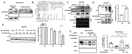 GATAD2B O-GlcNAcylation at the C-terminus is critical for protein stability and CSC function. (A)-TNBC cells MDA-MB-231 were treated with DMSO or OGA inhibitor Thiamet-G (2 µM) for 3 h prior to being collected for lysate. 250 µg of total protein from each condition was incubated with washed sWGA agarose bead overnight. The bead was then washed and analyzed by Western blot using indicated antibodies. For negative control we washed beads with incubated beads with GlcNAc to remove any O-GlcNAcylated proteins (lane 1). Sp1 was used as positive control. (B)-HEK-293T overexpressing GATAD2B was collected for immunoprecipitation using anti-GATAD2B antibody. Immunoprecipitated GATAD2B was subsequently analyzed using mass spectrometry. Mass spectrometry result shows detected O-GlcNAc modification at the C-terminus of GATAD2B. (C)-HEK-293T cells were transfected with HA-tagged wild-type (WT) GATAD2B or GATAD2B with S584/586/588/590A mutations (Mut) and were subsequently collected for lysate. Lysate from HEK-293T cells, control plasmid or overexpression WT or Mutant GATAD2B, were incubated with sWGA agarose bead overnight before analyzing by Western blot using indicated antibodies. For negative control we washed beads with incubated beads with GlcNAc to remove any O-GlcNAcylated proteins (lane 1). (D)-HEK-293T cells were transfected with WT or Mutant GATAD2B and were subsequently collected for immunoprecipitation using anti-GATAD2B antibodies. Immunoprecipitated proteins were analyzed by Western blot using indicated antibodies (left). Quantified graph shows increase in the level of poly-Ubiquitination co-immunoprecipitated with Mutant GATAD2B, compared to WT GATAD2B (right). One sample t-test against hypothetical value is reported as mean ± SEM, * p < 0.05. (E)-HEK-293T cell were transfected with control plasmid (lane 1), HA-tagged WT or Mutant GATAD2B and were subsequently treated with Cycloheximide (100 µM) for 0, 2 and 4 h before being collected for Western blot using indicated antibodies (left). Quantified graph shows decrease in the level of HA-tagged Mutant GATAD2B compared to WT GATAD2B overtime (right). Two-way ANOVA with Sidak test is reported as mean ± SEM, ** p < 0.01. (F)-TNBC cells transduced with control or GATAD2B-specific gRNA were infected with lentiviral vector containing WT or Mutant GATAD2B and were subsequently collected for Western blot using indicated antibodies (left). Quantified graph shows mammosphere formation efficiency of control or transduced with GATAD2B gRNA MDA-MB-231 cells overexpressing WT or Mutant GATAD2B (right). Two-way ANOVA with Sidak test is reported as mean ± SEM, ns—not significant, ** p < 0.01, *** p < 0.001, **** p < 0.001.