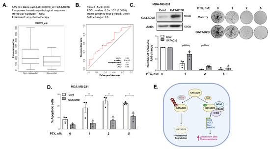 One notable characteristic of cancer stem-like cells is the ability to resist cell death caused by chemotherapeutic drugs [44]. To evaluate the potential role of GATAD2B in promoting chemoresistance, we analyzed the expression of GATAD2B in breast cancer patients receiving chemotherapy. In TNBC patients that did not respond to chemotherapy, the expression of GATAD2B was significantly higher compared to that of responding group with an area under the curve greater than 0.6 [32] (Figure 7A). This result suggests that GATAD2B may serve as a potential prognostic marker for chemoresistance in TNBC patients. To test this idea further, we stably overexpressed GATAD2B in MDA-MB-231 cells and treated with increasing dose of paclitaxel, a first line drug for TNBC [45]. In a dose-dependent manner, paclitaxel reduced the ability of MDA-MB-231 cells to grow in clonogenic assay (Figure 7B), as well as increased apoptosis (Figure 7C). However, MDA-MB-231 cells overexpressing GATAD2B are significantly resistant to paclitaxel effects compared to control cells (Figure 7B), especially at 1 nM and 2 nM. Similarly, the population of cancer cells undergoing apoptosis with GATAD2B overexpression was significantly reduced compared to control cells (Figure 7D). Similar results are seen in SUM159 cells overexpressing GATAD2B when compared to control cells (Supplementary Figure S6A,B), further confirming the potential role of GATAD2B in protecting breast cancer cells from chemotherapy. In addition, we show that overexpression of GATAD2B, but not GATAD2B-Mut, protects from paclitaxel mediated cell death (Supplementary Figure S7A,B) in MDA-MB-231 cells. These findings suggest a potential role of GATAD2B in promoting chemoresistance of breast cancer cells in vitro, and role of GATAD2B as a potential predictive marker for chemoresistance in aggressive breast cancers.