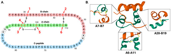 Figure 1. Proinsulin and insulin structure. (A) Linear proinsulin sequence highlighting the order of the six cysteine residues that form the three disulfide bonds. Sequence is colorized: brown is the B chain, green is the A chain, blue is C-peptide. (B) Structure of insulin highlighting the disulfide bonds between the A and B chains (A7-B7, A20-B19) and within the A chain (A6-A11), which are necessary for proper structure. Structure is colorized as follows: brown is the B chain; green is the A chain. Images were created using Mol* of 4EZT from the RCSB PDB [16,17].