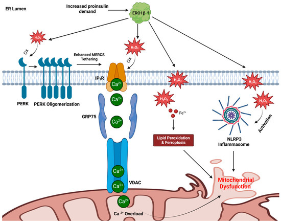 Figure 3. A model describing how ER hyperoxidation promotes mitochondrial dysfunction. With elevated demand for proinsulin synthesis, oxidative protein folding increases leading to excess ERO1β activity and hydrogen peroxide (H2O2) production. Hydrogen peroxide can oxidize PERK leading to its oligomerization, which enhances Mitochondrial-ER contacts (MERCs) tethering. Hydrogen peroxide can also oxidize IP3R and increase the transport of Ca2+ from the ER into the mitochondria through VDAC, leading to Ca2+ overload and mitochondrial dysfunction. Hydrogen peroxide can also diffuse from the ER into the mitochondria and cytosol and promote lipid peroxidation/ferroptosis and NLRP3 inflammasome activation, both of which can lead to mitochondrial dysfunction.