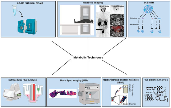 A wide range of technologies and approaches are being utilised in studying tumour metabolism (Figure 1), starting from metabolomics, which refers to the set of analytical chemical techniques used to characterise the composition of biochemical mixtures [7]. Metabolomic techniques can be used to profile a wide range of metabolites from a variety of sources, including cells, tissues, and bodily fluids [10]. Unlike genomics, transcriptomics, and proteomics, metabolomics cannot be performed using a single instrument or technique because metabolites have a wide range of concentrations, sources, and chemical properties [9]. Another limitation of current metabolomic techniques is that it is often challenging to accurately capture the cell’s metabolic state by quenching all its metabolic pathways [11]. As a result, most metabolomic techniques focus on profiling and quantifying a smaller subset of pre-selected metabolites. Different metabolic profiling tools are often combined to take advantage of their strengths and compensate for their weaknesses [12]. This section will focus on these tools and how they are combined to more comprehensively profile tumour metabolism.