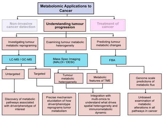 This section covers some key applications of the aforementioned metabolomics techniques in cancer research, in particular, how metabolomics can aid in tumour detection, understanding tumourigenesis, monitoring response to therapies, identifying novel metabolic vulnerabilities, and improving the outcome of existing therapies (Figure 2).