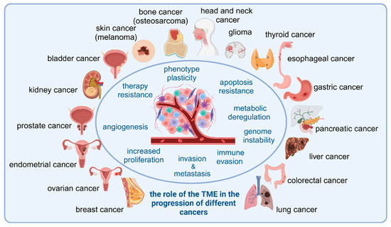This review summarizes the latest findings regarding the role of TME components in various cancer types (as presented in Figure 1).