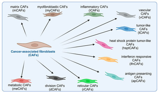 Thus, tumor tissue may contain: matrix CAFs (mCAFs), myofibroblastic CAFs (myCAFs), inflammatory CAFs (iCAFs), vascular CAFs (vCAFs), tumor-like CAFs (tCAFs), heat shock protein tumor-like CAFs (hsptCAFs), interferon-responsive CAFs (ifnCAFs), antigen-presenting CAFs (apCAFs), reticular CAFs (rCAFs), division CAFs (dCAFs) and metabolic CAFs (meCAFs) as shown in Figure 3 [26].