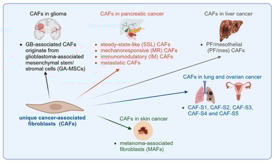 In different types of cancer, CAFs exist in various subtypes and proportions, which may additionally change depending on the stage of the cancer. What is important, CAFs can transform into other subtypes. For example, treatment with JAK inhibitors can lead to the transformation of iCAFs into myCAFs [7,21,32]. In this chapter, we outlined 11 common types of fibroblasts that are present in various cancers. Additionally, in the following chapters dedicated to different cancers, we also present atypical fibroblasts that are unique to a particular type of cancer.