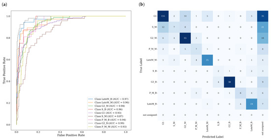 (a) Receiver Operating Characteristic (ROC) curves for each cell-cycle phase, computed using a one-vs-all approach. The legend displays the corresponding Area Under the Curve (AUC) scores. (b) Confusion matrix illustrating the manually assigned cell-cycle phases versus CNN predictions for the validation set. True positives are located along the diagonal.