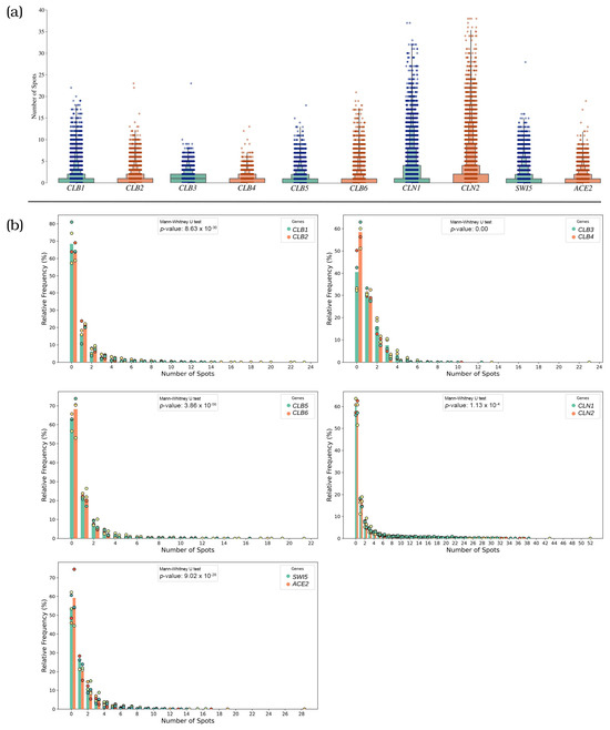 Analysis of mRNA distributions revealed varied expression patterns across the genes studied (Figure 3). The boxenplots illustrate mRNA detection across the entire cell population coming from three to five replicate experiments, highlighting the variability in expression levels. Results from the individual experiments can be found in Figure S2. Notably, CLN1 and CLN2 showed the highest overall expression, with mean values of 1.68 and 1.89 spots per cell, respectively. In contrast, CLB4 emerged as the least detected gene, with a mean value of 0.59 spots per cell. This variation highlights the diverse expression patterns among the genes. It had been suggested that gene expression can occur in two primary modes: continuous (constitutive) expression, where transcripts accumulate steadily over time, or bursty expression, where transcription happens in short, intense pulses [23]. Most of the regulators exhibited intense transcriptional bursts with some cells containing up to 52 transcripts for CLN2, while CLB3 and CLB4 displayed lower overall expression with less pronounced peaks of about 10 transcripts, suggesting an expression pattern with less intense bursts, closer to a constitutive rather than bursty expression. The histograms further elucidate the distribution of mRNA levels among individual cells. CLB1 and CLB2, CLB4, CLB5, CLB6, were all detected in between 38% to 32% of the cells. Interestingly, the paralogue pair with the lowest expression levels (CLB3/CLB4) had the highest proportion of cells without detectable spots, with 60% and 42% of cells showing no signal, respectively. These findings could suggest the hypothesis of a more constitutive expression pattern, characterized by lower but more widely distributed detection of spots across the entire cell population, though the very low numbers of measured mRNA molecules don’t allow for strong conclusion. Furthermore, despite their significantly higher mean expression levels, CLN1 and CLN2 were only detected in approximately 40% of the cells. These findings suggest that while CLN1 and CLN2 exhibit intense transcriptional bursts in individual cells, their activity may be more phase specific.