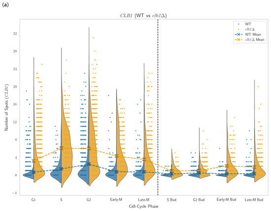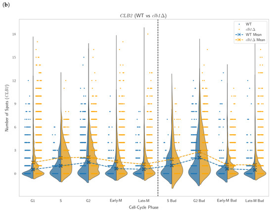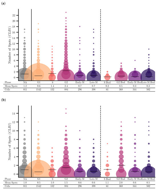 Distribution and mean number of mRNA spots per cell for (a) CLB1 and (b) CLB2 resolved over the cell-cycle phases.