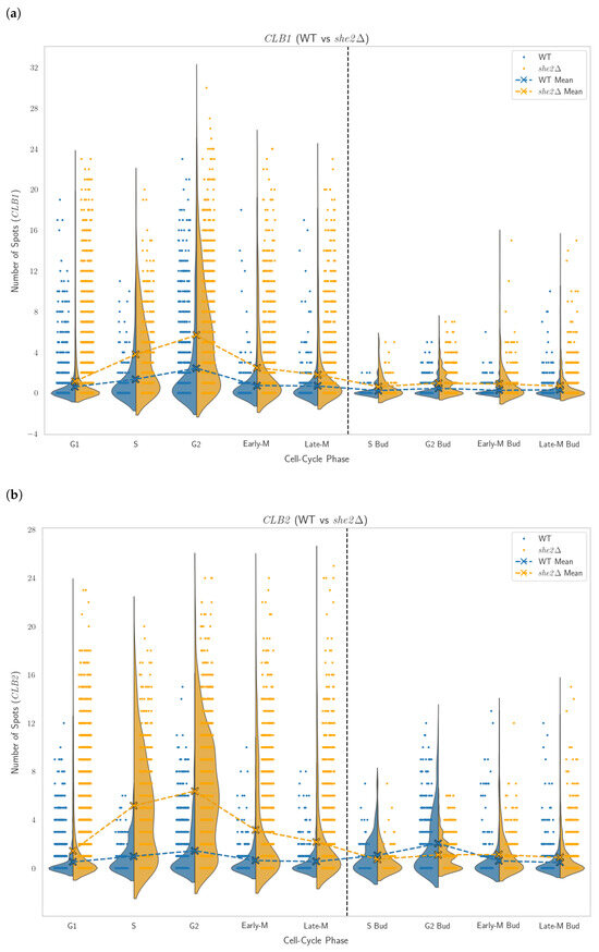 Distribution of mRNA spots counts across cell cycle phases for CLB1 and CLB2. (a) CLB1 expression in WT and she2Δ strains. (b) CLB2 expression in WT and she2Δ strains.