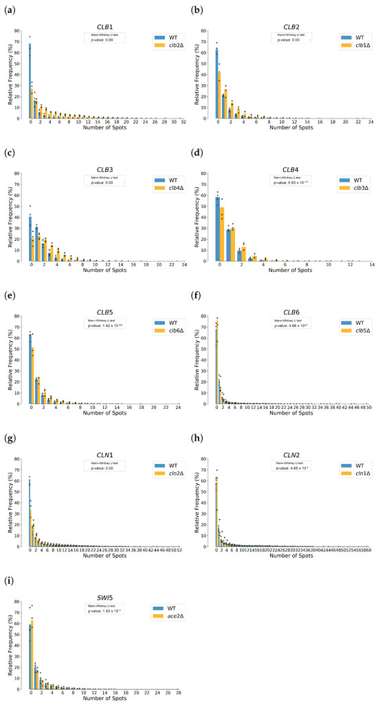 Distribution of mRNA spot counts for WT and deletion strains of paralogous genes with Mann-Whitney U-test. The x-axis represents the number of detected mRNA spots per cell, while the y-axis shows the relative frequency of cells with a given spot count. Each bar represents the pooled data from multiple experiments, with the dots indicating the mean value for one individual experiment. (a) Expression of CLB1 in WT and clb2Δ strains. (b) Expression of CLB2 in WT and clb1Δ strains. (c) Expression of CLB3 in WT and clb4Δ strains. (d) Expression of CLB4 in WT and clb3Δ strains. (e) Expression of CLB5 in WT and clb6Δ strains. (f) Expression of CLB6 in WT and clb5Δ strains. (g) Expression of CLN1 in WT and cln2Δ strains. (h) Expression of CLN2 in WT and cln1Δ strains. (i) Expression of SWI5 in WT and ace2Δ strains. The p-values of the Mann-Whitney U-test show strong differences between WT and deletion strain for CLB1, CLB2, CLB3 with p-values near cero. For CLB4, CLB5 and CLB6 p-values are still very small with the least significance for CLB6 which still shows a p-value small enough to hold the assumption that the two distributions for WT and deletion strain differ from each other. For CLN2, and SWI5 significance is smaller but still high enough for the assumption that mRNA distribution of the two strains differ from each other significantly.