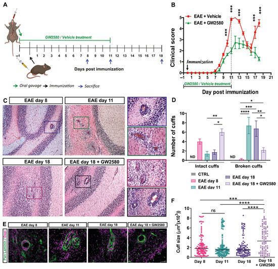 CSF1R inhibition decreased EAE clinical severity and the number of broken inflammatory perivascular cuffs. (A) A schematic representation of the experiment timeline. (B) Time course of the neurological disability score of EAE and EAE+GW2580 (means ± SD), showing EAE onset at day 8, peak at day 11 (acute phase), the remission phase at day 16, and relapse at day 18 for untreated animals and a delayed and reduced clinical score in the EAE+GW2580 group. (C) Hematoxylin and eosin (H&E) staining of EAE rat cerebellums at the onset of clinical signs (EAE day 8), EAE day 11: peak severity of clinical signs, EAE day 18: second peak, and EAE day 18+GW2580, showing inflammatory perivascular cuffs. Insets show higher magnification images of perivascular cuffs. (D) Quantification of the number of intact and broken perivascular cuffs in the healthy control and EAE rats within the different groups. (E) Immunofluorescence staining for pan-laminin (green) and cell nuclei (DAPI, magenta) of representative perivascular cuffs in the different EAE groups. GW2580 decreased leukocyte penetration of the perivascular cuffs. (F) Stereological analyses of EAE rats for cuff sizes, showing enlarged cuffs in rats treated with GW2580. Scale bars: C: 100 µm, E: 40 µm. Statistical analysis: (B) N = 6/group, two-way ANOVA and Bonferroni post-test (*** p < 0.001), (D) 3 images/rat (N = 6/group) were analyzed, two-way ANOVA and Tukey’s multiple-comparisons test (* p < 0.05, ** p < 0.01, *** p < 0.001, **** p < 0.0001), (F) cuff areas are all values measured N = 3/group, one-way ANOVA and Tukey’s multiple-comparisons test (*** p < 0.001, **** p < 0.0001).