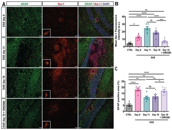 GW2580 treatment decreased glial activation in the cerebellum. (A) Immunofluorescence staining of thin (10 μm) cerebellum sections of EAE rats at disease onset: EAE day 8, EAE day 11: peak, EAE day 18: second peak, and EAE day 18+GW2580. Sections were stained with anti-Iba1 antibody to visualize microglia/macrophages (red), anti-GFAP antibody to mark astrocytes (green), and DAPI to visualize cell nuclei (blue). Mean Iba-1 fluorescence intensity (B) and the percent of GFAP-positive area (C) were measured in the different groups. Scale bar: 100 µm. Statistical analysis: 3 images/rat (N = 6/group) were analyzed, two-way ANOVA and Tukey’s multiple comparisons test (* p < 0.05, ** p < 0.01, *** p < 0.001, **** p < 0.0001).