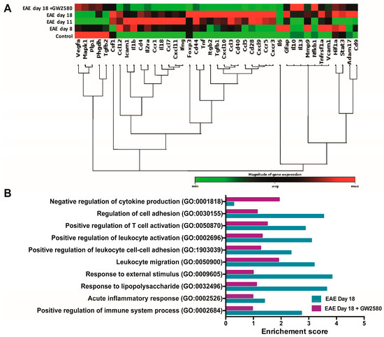 To define the mode of GW2580 action, real-time PCR (qPCR) was employed to investigate the expression of 41 genes coding for proteins and enzymes known to contribute to the maintenance of the BBB and/or its penetration by immune cells. Our analyses were performed on the spinal cord samples. The reason for using spinal cords (SC) for these analyses was the large numbers of cuffs/area compared to the cerebellum. The complete list of genes investigated is presented in Table S2. The results are presented in a clustergram; non-supervised hierarchical clustering was performed to generate a heat map with dendrograms indicating co-regulated genes across groups, and the criteria for significance are reported in the table of the magnitude of gene expression (Figure 3A). Of the 41 BBB genes tested, an early upregulation of most of the genes was observed as soon as symptoms appeared (8 DPI) and before the peak of the disease (11 DPI). Several endothelial cell adhesion genes, such as VCAM-1 and ICAM-1, were upregulated in the SC at 8 DPI. Most of the chemokines, such as CXCL-11, CCL-12, and CXCL-10, were also upregulated starting from 8 DPI (45.79, 14.22, and 11.13 Log 2-fold change). Our data revealed an upregulation starting from 8 DPI of MMP-9, with 3.2 Log 2-fold change. Most of these changes were not detected in SC from rats treated with GW2580 (Figure 3A and Table S2). Gene ontology enrichment analysis revealed a high enrichment score of genes linked to cell adhesion, immune activation, and inflammation in EAE on day 18 compared to the EAE day 18+GW2580 group (Figure 3B).