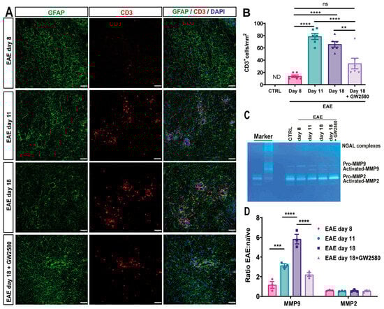 Matrix metalloproteinases (MMPs), particularly MMP-2 and MMP-9, are known to degrade components of the BBB and promote leukocyte infiltration into the CNS [10,40]. To investigate whether CSF1R inhibition affects MMP activity, we performed gelatin zymography on cerebellum lysates from control, untreated EAE, and GW2580-treated EAE rats at different disease stages (Figure 4C,D). In untreated EAE rats, we observed a progressive increase in MMP-9 activity starting on day 8 post-immunization, with the highest levels detected on day 18. Both pro-MMP-9 (~92 kDa) and its activated form (~82 kDa) were detected, with a significant increase in the ratio of activated to pro-MMP-9 on day 18 (Figure 4C,D). In contrast, GW2580 treatment markedly reduced MMP-9 activation on day 18, with the activated-to-pro-MMP-9 ratio significantly lower than in untreated EAE rats (p < 0.01, two-way ANOVA). MMP-2 was constitutively expressed in all groups, with no significant differences in activation across disease stages or treatment conditions. This suggests that GW2580 specifically impacts MMP-9, which has been implicated in the cleavage of astrocytic endfeet proteins and the promotion of leukocyte migration into the CNS parenchyma [8,41]. The reduction in MMP-9 activation in GW2580-treated animals correlated with fewer CD3+ T cells infiltrating the CNS parenchyma, as shown by immunofluorescence (Figure 4). These findings indicate that CSF1R inhibition may preserve BBB integrity, at least in part, by preventing MMP-9-mediated degradation of the parenchymal barrier, thereby limiting immune cell access to the CNS.