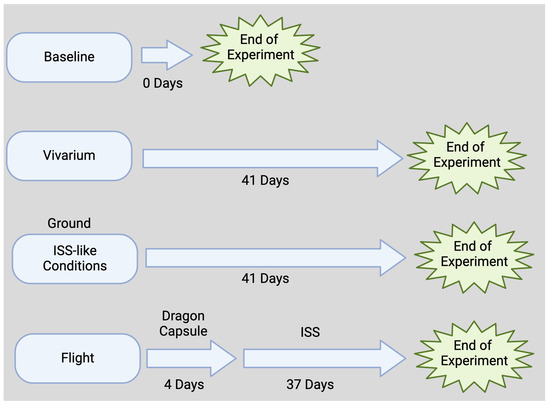 Animals in the vivarium group were animals that were housed under standard vivarium conditions and remained alive for the duration of study. Animals in the baseline group consisted of mice that were euthanized at the time when the animals in the flight group were launched.