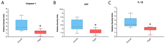 Inflammasome signaling proteins in the brain of mice in the ISS. Immunoblot of inflammasome proteins for the expression of (A) caspase-1, (B) ASC and (C) IL-1β in an area of the brain of mice other than cortex and hippocampus after 37 days of spaceflight. Data were normalized to β-actin as a protein loading control. Data presented as box-plots with dots as all data points. * p < 0.05. N = 5 per group.