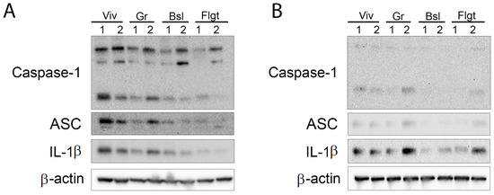 Inflammasome signaling proteins in the (A) cortex and (B) hippocampus of mice in the ISS. Immunoblot of inflammasome signaling proteins caspase-1, ASC and IL-1β in the cortex of mice after 37 days of spaceflight. Viv = Vivarium, Gr = Ground, Bsl = Baseline and Flgt = Flight. Data were normalized to β-actin as a protein loading control. N = 2 per group.
