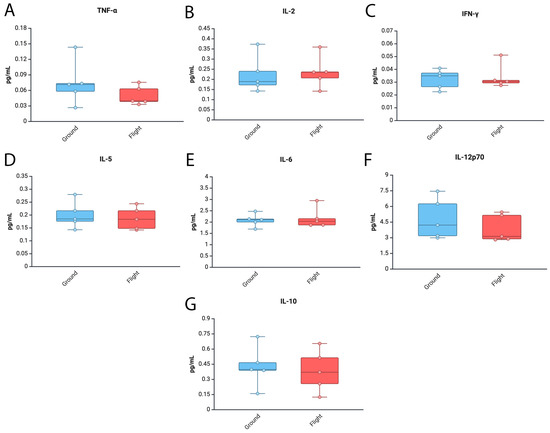 Inflammatory cytokine profiles in the brains of mice in the ISS. Protein levels of inflammatory cytokines (A) TNF-α, (B) IL-2, (C) IFN-γ (D) IL-5, (E) IL-6, (F) IL-12p70 and (G) IL-10 in an area of the brain of mice other than cortex and hippocampus after 37 days of spaceflight and measured by ECLIA. Data were normalized to total protein. Data presented as box-plots with dots as all data points. N = 5 per group.