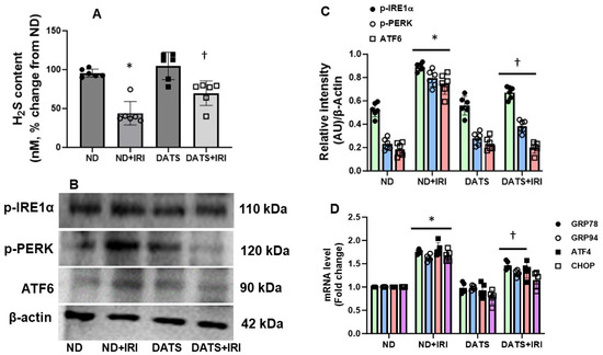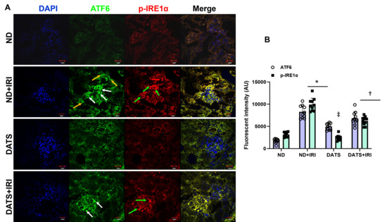 DATS treatment attenuated ER stress in aged kidney IRI. (A) Expression of unfolded protein response sensors, ATF6, and p-IRE1α. ATF6 was upregulated in the glomeruli and tubules (white and yellow arrows, respectively) and p-IRE1α was upregulated predominantly in the glomeruli compared to the tubules (green and red arrows, respectively). Scale bar, 20 μm. (B) Data are mean ± SD, n = 6/group, * p < 0.01 vs. ND, † p < 0.01 vs. ND and DATS, ‡ p < 0.01 vs. ND+IRI.