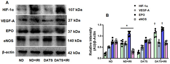 DATS supplementation in IRI enhanced the expression of angiogenesis markers in the kidney. (A) Representative bands of HIF-1α, VEGF-A, erythropoietin (EPO), and eNOS. (B) Densitometric analysis of protein expression as mean ± SD, n = 6/group, * p < 0.01 vs. ND or DATS alone, † p < 0.01 vs. ND+IRI.