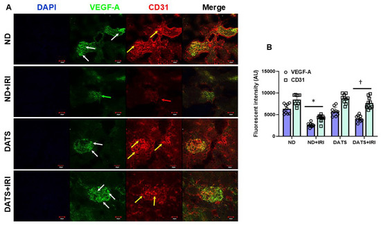 DATS treatment increased angiogenesis after IRI in the aged kidney. (A) Expression of angiogenesis markers, VEGF-A, and CD31 was decreased in the ND+IRI kidney (green and red arrows, respectively) and increased with DATS (white and yellow arrows, respectively). Scale bar, 20 μm (B) Data are mean ± SD, n = 6/group, * p < 0.01 vs. ND, † p < 0.01 vs. ND+IRI.