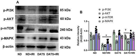 DATS activated p-PI3K, p-AKT, p-mTOR, and p-MAPK pathways in renal IRI. (A) Representative image of protein expression of signaling molecules of endothelial proliferation and survival. (B) Densitometry analysis of protein expression as mean ± SD, n = 6/group, *, ϕ p < 0.01 vs. ND, † p < 0.05 vs. ND+IRI.