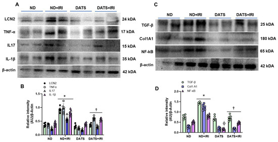 While sexual dimorphism in renal IRI is well known [47,48], the changes in IRI-induced inflammation in aged female kidney remains less studied. We therefore measured the protein expression of inflammatory markers, lipocalin-2 (LCN2), TNF-α, IL-17, and IL-1β. In the ND+IRI kidney, LCN2 increased by 2.5-fold, TNF-α by 2.6-fold, IL-17 by 2.6-fold, and IL-1β by 2-fold compared to the ND kidney without IRI (Figure 6A,B). In contrast, DATS+IRI kidneys normalized LCN2 levels comparable to ND kidneys and reduced the expression of TNF-α, IL-17, and IL-β by 0.6-fold, 0.5-fold, and 0.68-fold, respectively, from ND+IRI kidney levels (Figure 6A,B). The expression of inflammatory markers did not differ between ND and DATS kidneys (Figure 6A,B).