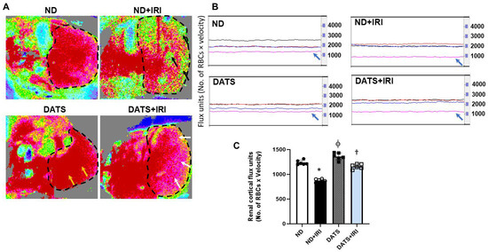 DATS improved renal cortical blood flow in the IRI kidney. (A) Representative laser Doppler flowmetry images showing renal cortical perfusion. The kidney is outlined by black dashed lines. Reduction of blood flow in ND+IRI kidney is shown as a low-intensity signal (green areas, black arrows), and improvement in blood flow is shown as pink areas (white arrows) in DATS+IRI kidney. DATS alone increased blood flow in the DATS kidney (yellow arrows). (B) Line traces from the kidney. Black trace is from the aorta, red trace is from the renal artery, blue trace is from the renal vein, and pink trace is from the renal cortex (blue arrow). (C) Data are expressed as mean ± SD, n = 6/group, *, ϕ p < 0.01 vs. ND, † p < 0.01 vs. ND+IRI.