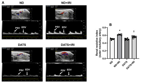 DATS treatment reduced the increased resistive index (RI) of outer medullary arteries caused by IRI in the aged kidney. (A) Representative ultrasound images of the kidney showing color Doppler of vessels in the outer cortico-medullary area. Pulsed-wave Doppler was placed on the outer medullary arteries to acquire data. The resistive index (RI) was measured using the formula RI = (PSV − EDV)/PSV. RI—resistive index, PSV—peak systolic velocity, EDV—end-diastolic velocity. (B) Values are mean ± SD, n = 6/group, * p < 0.01 vs. ND, † p < 0.01 vs. ND+IRI.