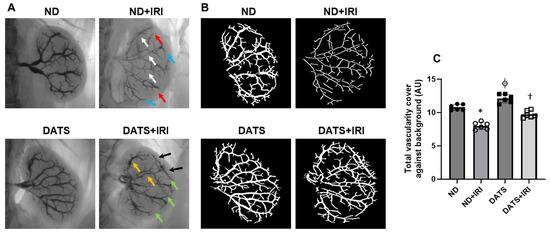 Renal IRI caused functional vascular rarefaction in the aged kidney and DATS treatment improved renal vascular density. (A) Representative barium sulfate angiography images of renal vasculature characterized by narrowing of lobar arteries (white arrows), loss of arcuate and interlobular branches (red and blue arrows, respectively), DATS rescues renal vasculature in WT+DATS+IRI kidney (yellow, green, and black arrows). (B) Vessel segmentation analysis images of total vasculature against the background. Vessel segmentation was conducted using VesSeg software (VesSeg_V0.1.4, University of Lubeck, Lubeck, Germany), (C) Data are mean ± SD, n = 6/group, *, ϕ p < 0.01 vs. ND, † p < 0.01 vs. ND+IRI.