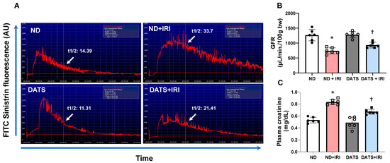 Plasma creatinine was measured to confirm renal dysfunction. In the ND+IRI group, plasma creatine was increased and correlated with declining GFR (Figure 10B,C). In the DATS+IRI group, creatinine levels decreased compared to the ND+IRI group (Figure 10C). There was no change in creatinine levels between the ND and DATS groups (Figure 10C).