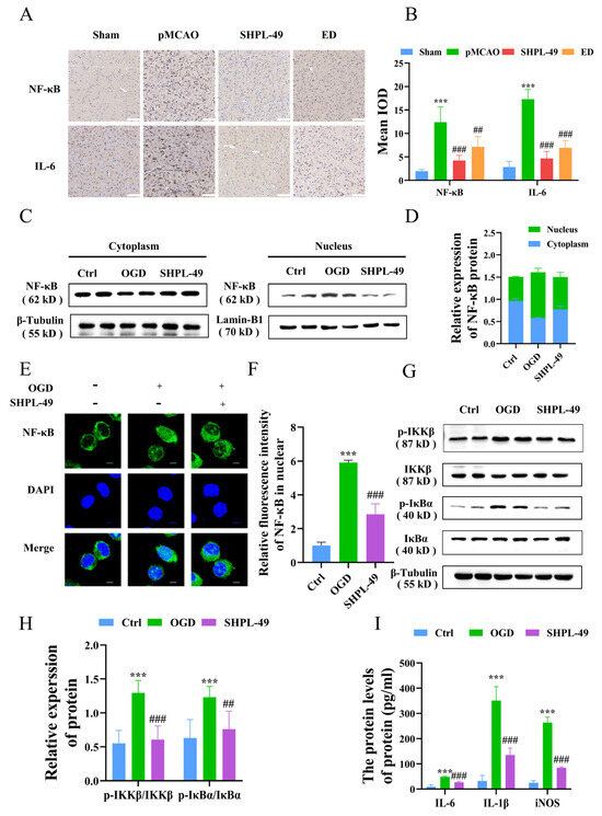 SHPL-49 exerts anti-inflammatory effects by suppressing the NF-κB signaling pathway. (A) Immunohistochemical staining images of NF-κB and IL-6 in brain tissue sections from rats subjected to pMCAO and treated with SHPL-49 (15 mg/kg) and ED (7.5 mg/kg) for three days, Scale = 100 μm. (B) The IODs for NF-κB and IL-6 immunohistochemistry in brain tissue sections for each treatment group. (C) Representative Western blot of NF-κB in the nucleus and cytoplasm of OGD-BV2 cells after treatment with SHPL-49 (200 μM). (D) Quantification of the Western blot results. (E) Immunofluorescence staining pattern of NF-κB in OGD-BV2 cells following treatment with SHPL-49 (200 μM); Scale = 10 μm. (F) Quantification of the average fluorescence intensity of NF-κB in the nucleus of BV2 cells. (G) Representative Western blot of p-IKKβ, IKKβ, p-IκBα, and IκBα proteins in OGD-BV2 cells after treatment with SHPL-49 (200 μM). (H) Quantification of the Western blot results. (I) The protein expression levels of inflammatory factors IL-6, IL-1β, and iNOS in the supernatant of OGD-BV2 cells following treatment with SHPL-49 (200 μM). Data are presented as means ± SD with n = 6 per group. *** p < 0.001 vs. Ctrl; ## p < 0.01, ### p < 0.001 vs. OGD.