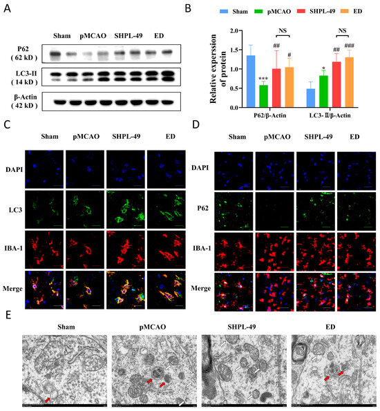 SHPL-49 attenuates excessive autophagy in the brain tissue of rats with pMCAO. (A) The Western blot analysis of P62 and LC3-II protein expression in rats with pMCAO treated with SHPL-49 (15 mg/kg) and ED (7.5 mg/kg) for three days. (B) Quantification of the Western blot results. (C,D) Immunofluorescence staining images of IBA-1-P62 and IBA-1-LC3II in brain tissue sections of rats subjected to pMCAO treated with SHPL-49 (15 mg/kg) and ED (7.5 mg/kg) for three days. Scale = 50 μm (E) Revealing autophagosomes in brain tissue through transmission electron microscopy observation. Data are presented as means ± SD, with n = 3 per group. Scale = 500 nm. * p < 0.05, *** p < 0.001 vs. Sham; # p < 0.05, ## p < 0.01, ### p < 0.001 vs. pMCAO.; NS, Not Significant.