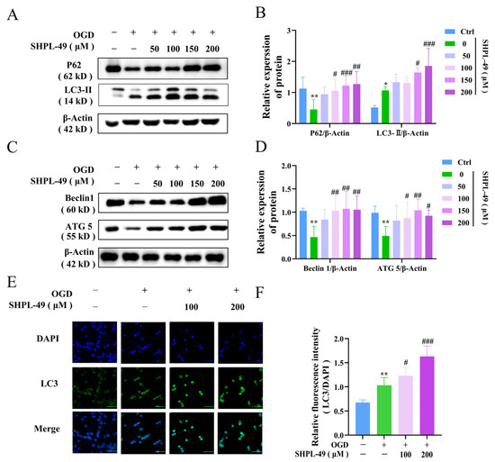 To validate the regulatory role of SHPL-49 in microglial autophagy, we established an in vitro model of oxygen–glucose deprivation (OGD) using BV2 cells. The impact of varying concentrations of SHPL-49 on the expression of autophagy proteins in OGD-BV2 cells was evaluated through Western blot analysis (Figure 3A–D). Compared to the Control group, the OGD-BV2 group exhibited a significant decrease in the expression levels of P62, ATG5, and Beclin-1 proteins. Importantly, treatment with 100 µM, 150 µM, and 200 µM of SHPL-49 effectively reversed the protein expression alterations induced by OGD in BV2 cells. Furthermore, the OGD-BV2 group exhibited a significant elevation in LC3-II protein. Moreover, treatment with 150 µM and 200 µM of SHPL-49 further increased the expression of the LC3-II protein. The observed elevation can be attributed to an excessive induction of autophagy in BV2 cells during OGD, leading to the accumulation of LC3-II protein. However, treatment with SHPL-49 appeared to inhibit autophagic flux, resulting in a further augmentation of LC3-II levels. To further substantiate these findings, immunofluorescence experiments were conducted (Figure 3E,F). In the OGD-BV2 group, a granular accumulation of the LC3 protein was observed. Conversely, in the SHPL-49 treatment group, a significant enhancement in green fluorescence intensity representing granular LC3 protein was significantly noted, suggesting that SHPL-49 may promote the aggregation of LC3 puncta by further impeding autophagy.