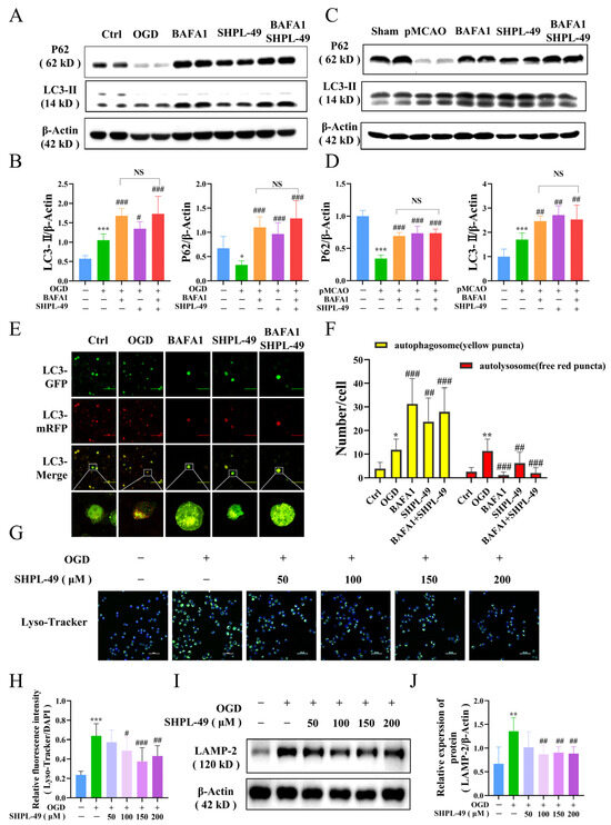 SHPL-49 impedes the autophagic flow in OGD-BV2 cells through the inhibition of lysosomal activity. (A) Representative Western blot of P62 and LC3-II in OGD-BV2 cells treated with SHPL-49 (200 μM) and BAFA1 (200 nM), Scale = 100 μm. (B) Quantification of the Western blot results. (C) Representative Western blot of P62 and LC3-II in brain tissue from pMCAO rats treated with SHPL-49 (15 mg/kg) and BAFA1 (1 mg/kg) three days post-stroke. (D) Quantification of the Western blot results. (E) Representative fluorescence images of OGD-BV2 infected with mRFP-GFP-LC3 adenovirus. (F) Quantification of red and yellow fluorescence spots in OGD-BV2 cells. (G) Representative immunofluorescence staining of lysosomes in OGD-BV2 cells treated with SHPL-49 (100 μM, 200 μM); Scale = 50 μm. (H) The quantification of average fluorescence intensity for Lyso-Tracker. (I) Representative Western blot of LAMP-2 in OGD-BV2 cells treated with different concentrations of SHPL-49. (J) Quantification of the Western blot results. Data are presented as means ± SD, n = 6 per group. * p < 0.05, ** p < 0.01, *** p < 0.001 vs. Ctrl; # p < 0.05, ## p < 0.01, ### p < 0.001 vs. OGD; NS, Not Significant.