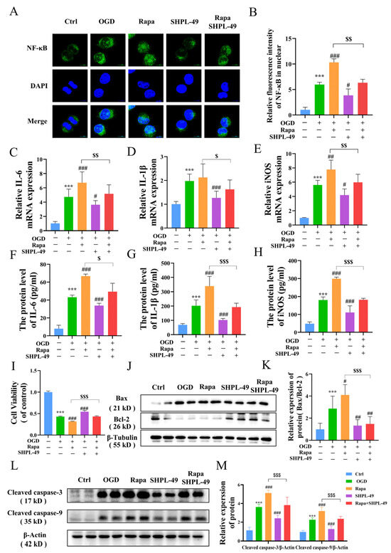 SHPL-49 reduces inflammation by suppressing excessive autophagy and NF-κB signaling in OGD-BV2 cells. (A) Immunofluorescence staining of NF-κB in OGD-BV2 cells treated with SHPL-49 (200 μM) and Rapa (100 nM); Scale = 10 μm. (B) Quantification of the average fluorescence intensity of NF-κB in the nucleus of OGD-BV2 cells. (C–E) The mRNA levels of IL-6, IL-1β, and iNOS in OGD-BV2 cells treated with SHPL-49 (200 μM) and Rapa (100 nM). (F–H) The protein levels of IL-6, IL-1β, and iNOS in the supernatants of OGD-BV2 cells treated with SHPL-49 (200 μM) and Rapa (100 nM). (I) The viability of PC12 cells was assessed by co-culturing them with OGD-BV2 cells treated with SHPL-49 (200 μM) and Rapa (100 nM) with PC12 cells. (J) Representative Western blot of BAX and Bcl-2 in PC12 cells after co-culture treatment. (K) Quantification of the Western blot results. (L) Representative Western blot of Cleaved caspase-3 and Cleaved caspase-9 in PC12 cells after co-culture treatment. (M) Quantification of the Western blot results. Data are presented as means ± SD, n = 6 per group. *** p < 0.001 vs. Ctrl; # p < 0.05, ## p < 0.01, ### p < 0.001 vs. OGD; $ p < 0.05, $$ p < 0.01, $$$ p < 0.001 vs. Rapa. Scale = 10 μm.