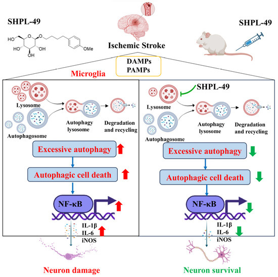 Based on previous pharmacological studies investigating the neuroprotective effects of SHPL-49 in rats with cerebral ischemia, we further explored the effects of SHPL-49 on microglial autophagy and neuroinflammation. Overall, as shown in the Schematic diagram (Figure 6), the findings suggest that SHPL-49 hinders autophagy by suppressing lysosomal activity and the fusion between autophagosomes and lysosomes, thereby suppressing autophagy and reducing NF-κB pathway activation and exerting an anti-neuroinflammatory effect. This study provides valuable experimental data for researching treatments targeting neuroinflammation in ischemic stroke while also offering new potential active compounds for treating this condition and presenting a novel approach to developing and applying neuroprotective agents.