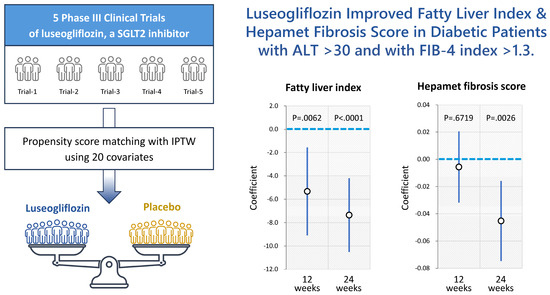 - Kawaguchi, T.; Murotani, K.; Kajiyama, H.; Obara, H.; Yamaguchi, H.; Toyofuku, Y.; Kaneko, F.; Seino, Y.; Uchida, S. Effects of luseogliflozin on suspected MASLD in patients with diabetes: A pooled meta-analysis of phase III clinical trials. J. Gastroenterol. 2024, 59, 836–848. [Google Scholar] [CrossRef]