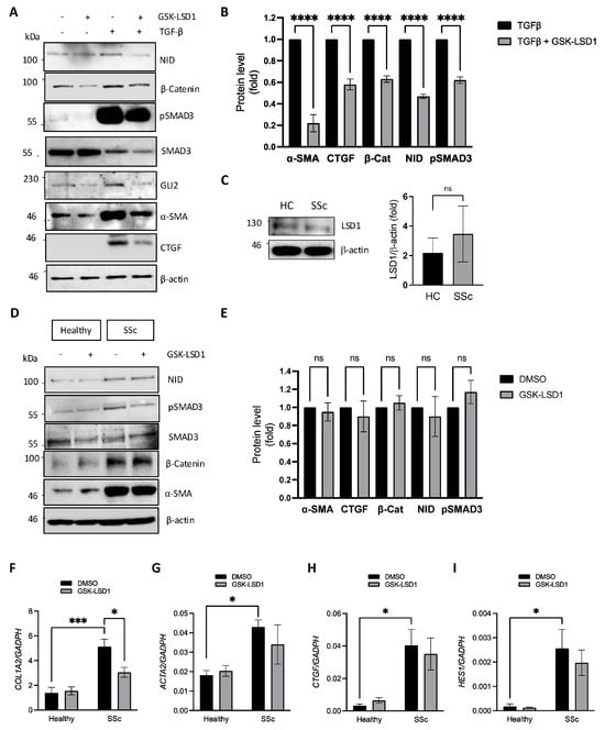 LSD1 activity is dispensable for basal fibrotic marker expression but is required for TGF-β signalling in SSc fibroblasts. (A) SSc dermal fibroblasts were stimulated or not stimulated with 10 ng/mL TGF-β in the presence or absence of 10 µM GSK-LSD1 for 48 h. NID, β-Catenin, pSMAD3, total SMAD3, GLI2, α-SMA, and CTGF protein levels were assessed by Western blot, using β-actin as loading control. (B) Densitometric analysis of pSMAD3, α-SMA, CTGF, NID, and β-catenin protein level changes in SSc fibroblasts treated with TGF-β in the presence or absence of GSK-LSD1 (n = 3). Data are derived from 3 independent experiments. (C) LSD1 protein levels were assessed in healthy (n = 3) and SSc (n = 3) dermal fibroblast protein lysates. (D) Healthy and SSc dermal fibroblasts were treated with DMSO or 10 µM GSK-LSD1 for 48 h, followed by analysis of protein levels of NID, β-catenin, pSMAD3, total SMAD3, and α-SMA by Western blot, using β-actin as loading control. (E) Densitometry analysis of α-SMA, CTGF, β-catenin, NID, and pSMAD3 protein levels in SSc fibroblasts treated with GSK-LSD1 (n = 3). Data are derived from 3 independent experiments. In addition, RNA was extracted from healthy and SSc fibroblasts treated in the same manner followed by relative quantification of COL1A2 (F), ACTA2 (G), CTGF (H), and HES1 (I) transcript levels via qPCR analysis. All graphs represent the mean +/− standard error for three independent experiments. ns, not significant, * p < 0.05, *** p < 0.001, **** p < 0.0001 in one-way ANOVA followed by multiple comparisons (t-tests).