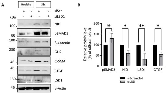 The experiments with GSK-LSD1 in SSc fibroblasts suggest that LSD1 has a limited role in regulating pro-fibrotic gene expression in SSc dermal fibroblasts. An alternative interpretation is that LSD1 demethylase activity, as part of the co-REST complex, is not required for maintenance of the fibrotic phenotype. To test the possibility of a non-enzymatic role of LSD1 in SSc, we assessed pro-fibrotic gene expression in healthy and SSc dermal fibroblasts transfected with LSD1 siRNA or a scrambled siRNA control. The LSD1 siRNA treatment reduced LSD1 protein levels by 70% in both healthy and SSc fibroblasts (Figure 4A,B). Interestingly, unlike the irreversible LSD1 inhibitor, silencing of LSD1 reduced expression of NID and CTGF (Figure 4A,B). In addition, LSD1 siRNA reduced β-catenin, α-SMA, and GLI2 expression levels (Figure 4A). The lack of effect of an irreversible LSD1 inhibitor on basal fibrotic gene expression but for COL1A2 in SSc fibroblasts, together with the more profound changes caused by knockdown of LSD1, suggests a non-canonical, demethylase-independent role for LSD1 in maintenance of pro-fibrotic gene expression in SSc dermal fibroblasts.