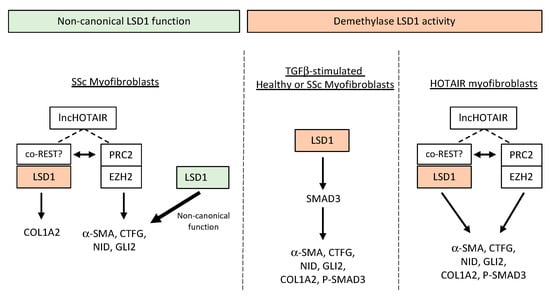 The role of the LSD1 in activated myofibroblasts of different origin. (Right) Schematic model of the function of enzymatic LSD1 in TGF-β-stimulated normal or SSc fibroblasts and in HOTAIR-expressing fibroblasts, presumably through complex formation with co-REST (orange). (Left) Non-enzymatic activity of LSD1 regulating pro-fibrotic gene expression is more important in maintenance of the primed SSc fibrotic phenotype (green).