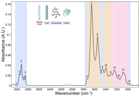Average FTIR spectra acquired in hippocampal layers of freeze-dried tissue. The numbers indicate peaks assigned to a specific chemical bond (related to Table 1) and classified into main biomolecular compounds—lipids, proteins and ester, nucleic acids and carbohydrates indicated by band colors.
